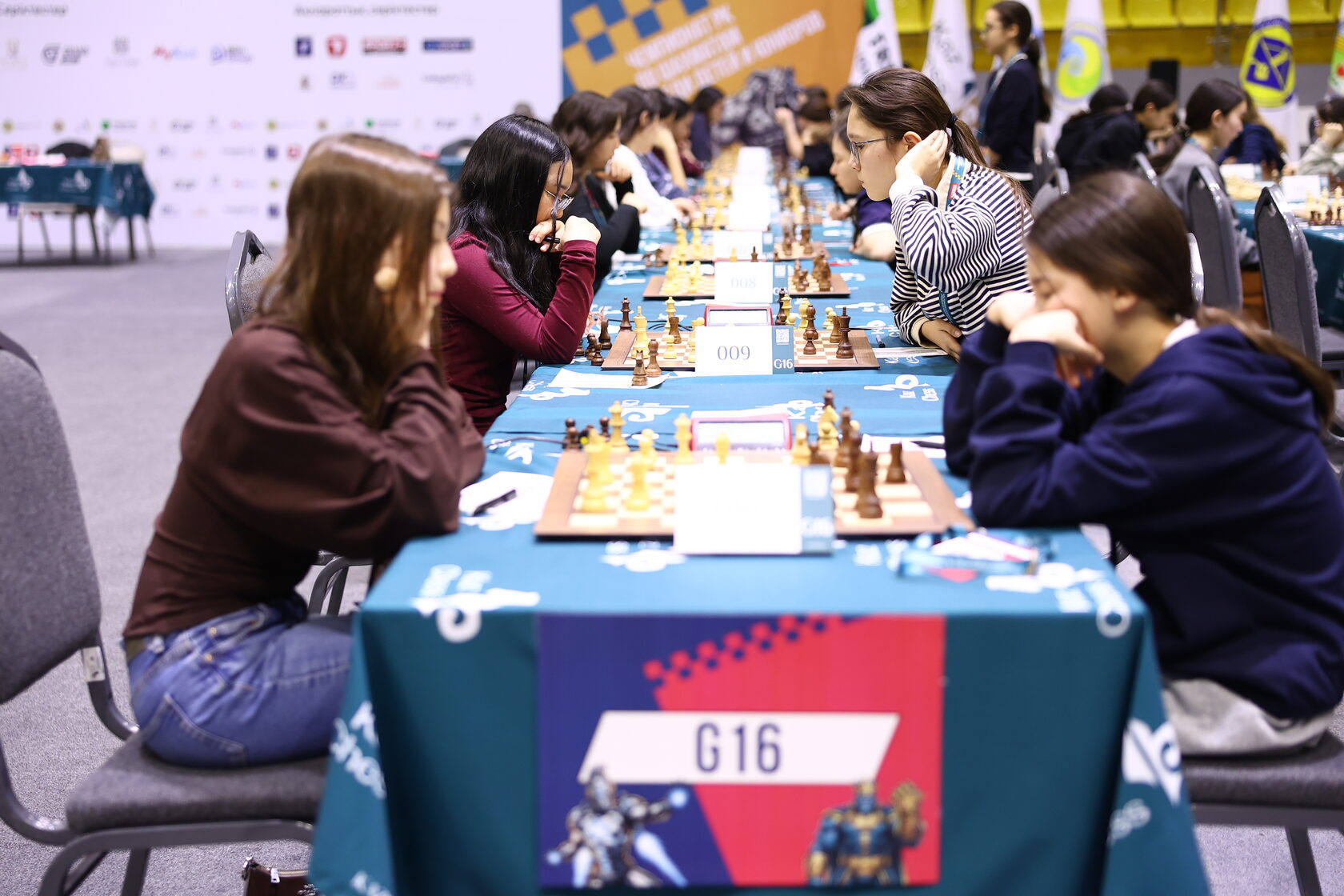 G16 (56 участниц):1–4. Асия Асылхан (2014), WFM Адриана Сермухамедова (2123), Айлин Заркым (1894) и Азель Тулекенова (1665) – по 3 очка; 5–8. Севинч Набиханова (1448), Малика Джаппарбекова (2023), Алуна Аубакирова (1666) и Мунира Рау (1642) – по 2½.